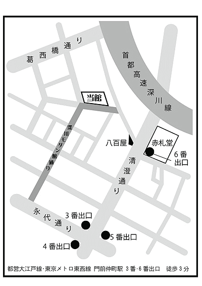 東京メトロ東西線、都営地下鉄大江戸線 門前仲町駅 6番または3番出口から徒歩3分 ※一般用駐車場がございませんので、車でのご来館はご遠慮ください。